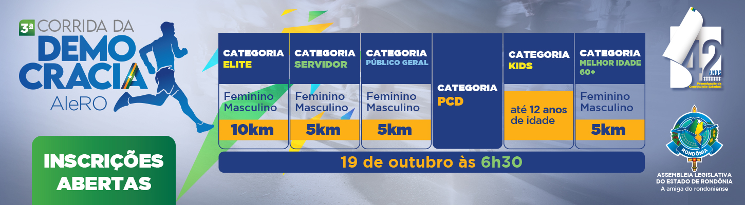 A Assembleia Legislativa de Rondônia (Alero) abriu, às 16h desta sexta-feira (26), as inscrições para a 3ª Corrida da Democracia. O evento, que integra a programação dos 42 anos da instituição, acontece em 19 de outubro, em Porto Velho, com largada prevista para as 6h30.