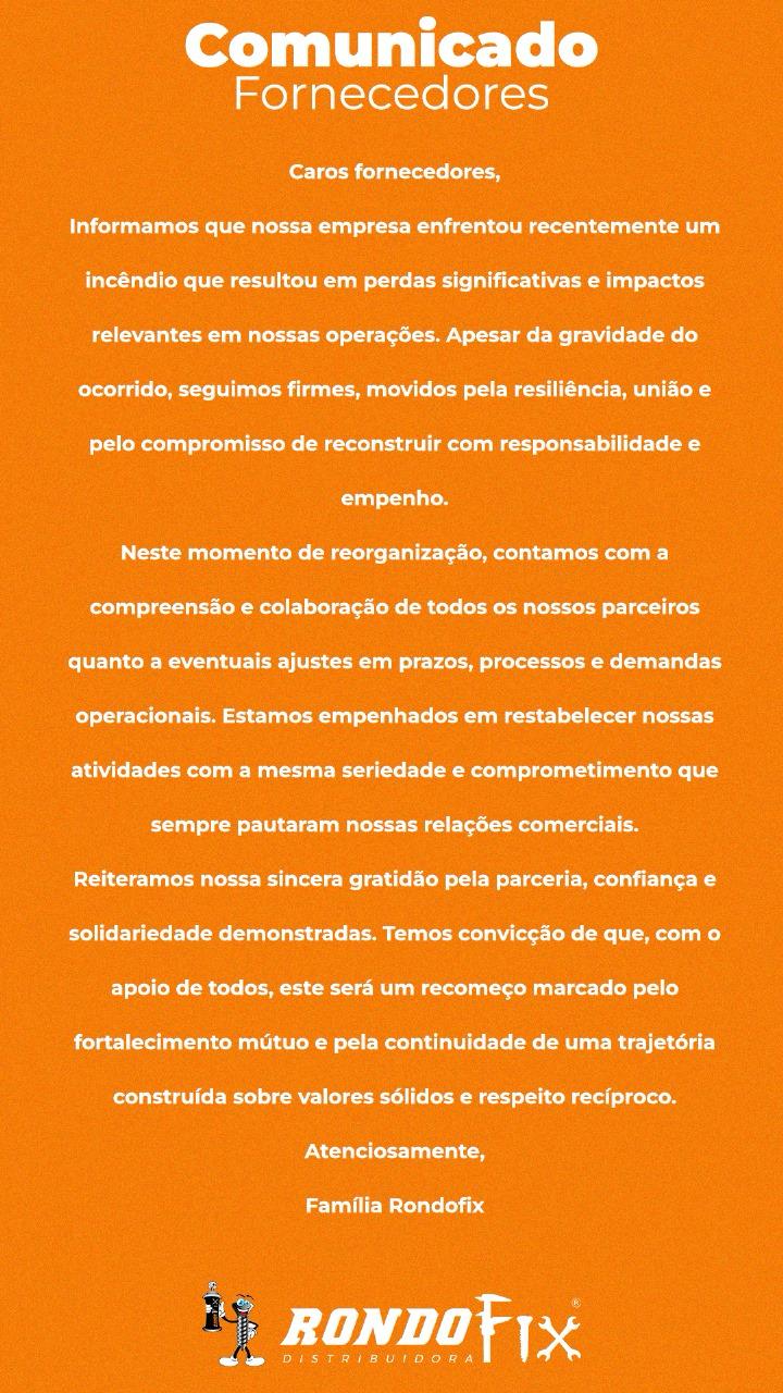Após a tragédia, a Família Rondofix emitiu um Comunicado Oficial aos Fornecedores (veja a imagem abaixo). No texto, a empresa informa sobre as perdas significativas e o compromisso de reconstrução, movida por “resiliência, união e empenho.”
