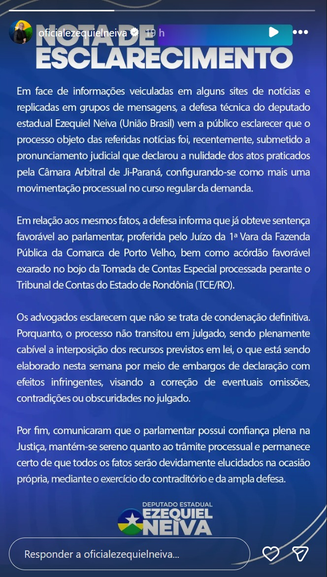 A equipe jurídica do deputado estadual Ezequiel Neiva divulgou uma nota de esclarecimento após a ampla repercussão da decisão judicial que o condenou, junto ao procurador-geral da Assembleia Legislativa, Luciano José da Silva, por improbidade administrativa. A defesa afirma que a situação apresentada em sites e grupos de mensagens não reflete todo o contexto do processo e, por isso, decidiu se manifestar publicamente.